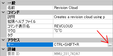 4. [プロパティ]ペインで、[キー]ボックス内をクリックしてから[]ボタンをクリックして、[ショートカット キー]ダイアログ ボックスを開きます。