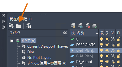 - [画層プロパティ管理]の[フィルタ]ペインで、現在に設定する画層フィルタを選択します。