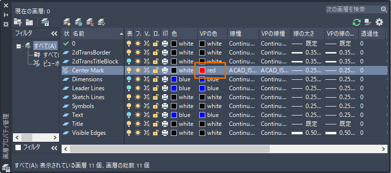 - 画層 Center Mark の色を赤に変更します。このビューポートに対してのみ色の変更を適用するには、[VP の色]列で色を選択します。
