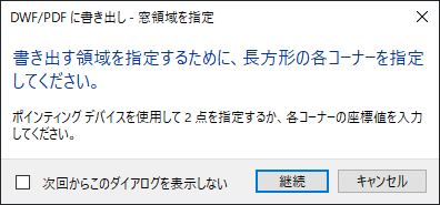 - [DWF/PDF に書き出し - 窓領域を指定]メッセージ ボックスで、[継続]をクリックして領域を選択します。