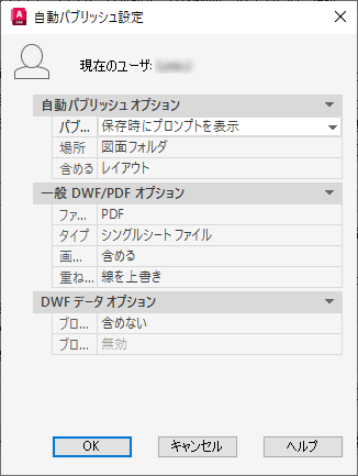 PDF または DWF を作成するかどうかをコントロールする場合、[パブリッシュ オン]の設定を[保存時にプロンプトを表示]または[閉じる時にプロンプトを表示]に設定できます。