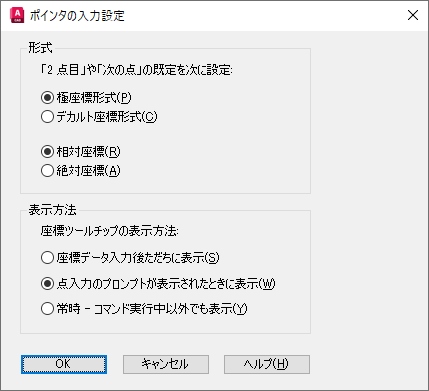 [ポインタの入力]領域の[設定]は、ダイナミック入力がアクティブなときの座標値の入力方法に影響します。[設定]をクリックすると、[ポインタの入力設定]ダイアログ ボックスが表示されます。