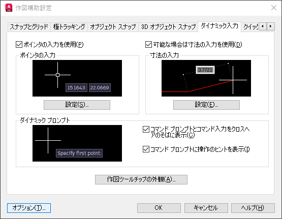 次に、[作図補助設定]ダイアログ ボックスの[ダイナミック入力]タブの設定の概要を示します。