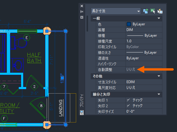 注釈モニターがオフの場合、寸法が自動調整か非自動調整かを示すインジケータは表示されません。[プロパティ]パレットまたは LIST[オブジェクト情報]コマンドを使用して、寸法のステータスを確認することができます。