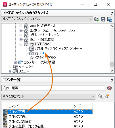2. [コマンド一覧]ペインの[コマンド一覧を検索]テキスト ボックスに、ブロックと入力します。[ブロック定義] (BLOCK[ブロック登録]コマンド)を選択し、[HYT パネル]の下の[行 1]にドラッグします。