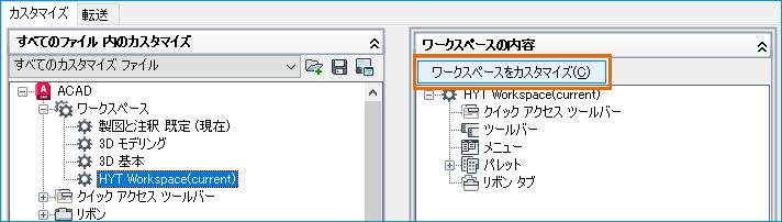 2. 現在のワークスペースを選択し、[ワークスペースの内容]ペインの[ワークスペースをカスタマイズ]をクリックします。