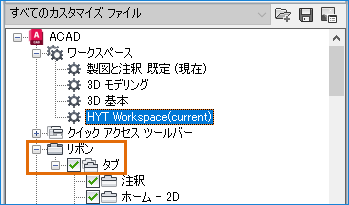 新しいリボン タブが、ワークスペースに自動的に追加されることはありません。次の手順では、現在のワークスペースに[HYT タブ]を追加する方法を説明します。