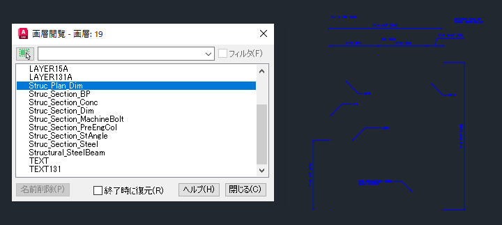 - [画層閲覧]ダイアログ ボックスで、リストから Struc_Plan_Dim を選択します。