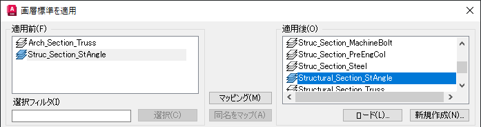 - [適用前]リストで Struc_Section_stAngle を選択し、[適用後]リストで Structural_Section_StAngle を選択します。[マッピング]をクリックします。