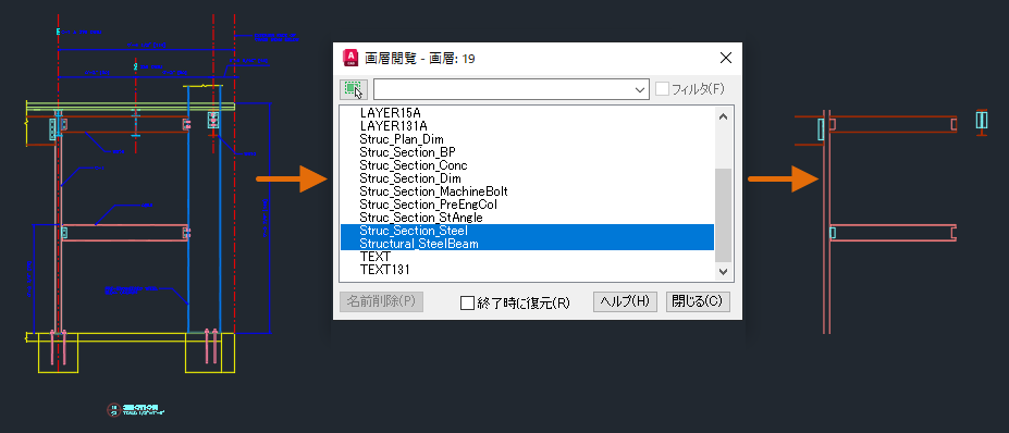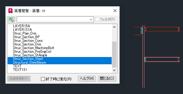 - [Ctrl]キーを押しながら表示する画層を選択すると、一度に複数の画層を選択できます。[Ctrl]キーを押しながら、Struc_Section_Steel を選択します。