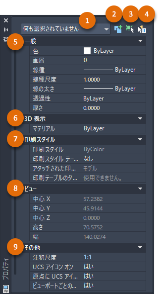 5 一般 選択したオブジェクトの一般プロパティまたは現在の図面の設定(何も選択されていない場合)が表示されます。この領域には、画層ツールのセットも含まれています。