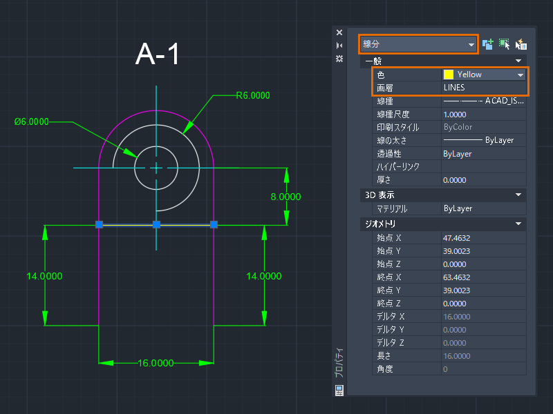 選択したオブジェクトのプロパティを ByLayer に変更すると、現在の画層のプロパティの値が継承されます。選択したオブジェクトの[色]プロパティが ByLayer に設定されているため、オブジェクトには LINES 画層に定義されている色が表示されます。