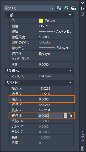オブジェクトが異なれば、Z 軸プロパティの名前も異なります。オブジェクトには、次のプロパティの 1 つまたは組み合わせが存在する可能性があります: 始点 Z、終点 Z、位置 Z (マルチ テキスト)、中心 Z (円)、高度(ポリライン)。