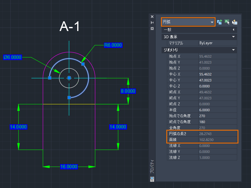 2. プロパティを確認します。コマンドを使用せずに、計算された面積および円弧の長さを簡単に確認することができます。