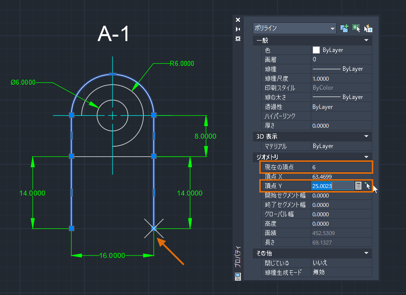 これで、ポリラインの最初と最後の頂点が位置合わせされました。この方法による頂点編集は、必要な絶対座標がわかっている場合に便利です。