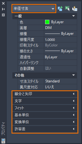 パレットに表示されるプロパティおよび設定は、選択したオブジェクトまたは作図状況(ブロック挿入中、またはレイアウト上のビューポート内)によって異なります。たとえば、寸法を選択すると、寸法オブジェクト タイプに固有の追加プロパティが表示されます。