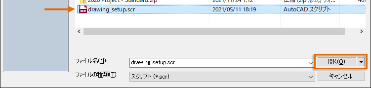 [ファイル名]テキスト ボックスで、既定の文字列を選択してから、drawing_setup.scr と入力します。