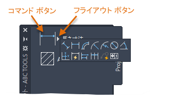 • [コマンド文字列] – ツールがクリックされたときに実行されるコマンド マクロが含まれます。このオプションは、[フライアウトを使用]オプションがオフの場合にのみ使用可能です。
