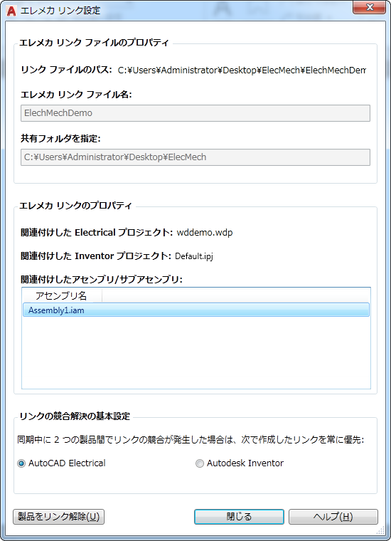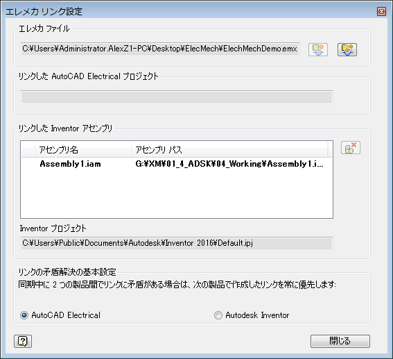 Inventor でエレメカ プロジェクトを作成してから、AutoCAD Electrical toolset からリンク ファイルに接続して、AutoCAD Electrical toolset プロジェクトをリンクします。