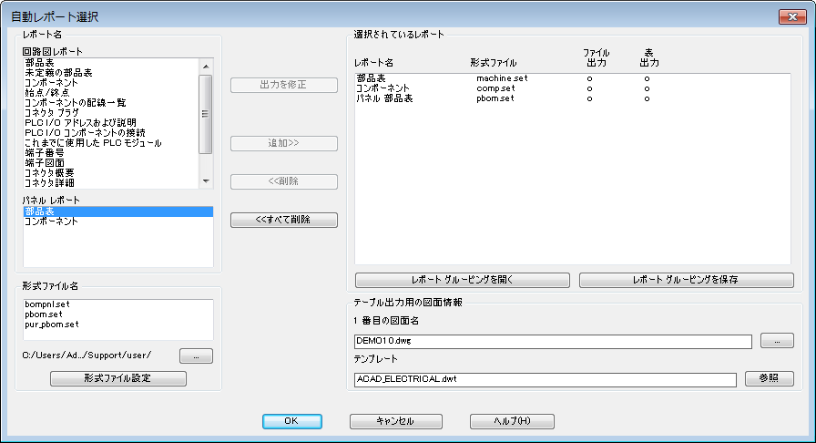 実行するレポートごとに、レポート名および形式ファイル(.set)を選択します。形式ファイルでは、ファイルの出力、表の出力、またはその両方を定義する必要があります。