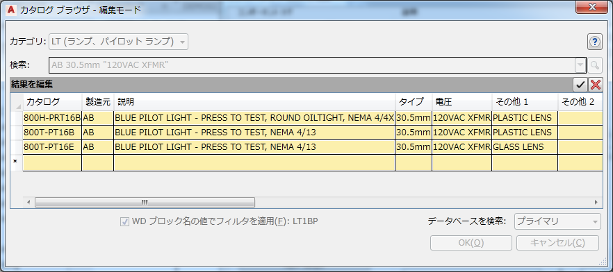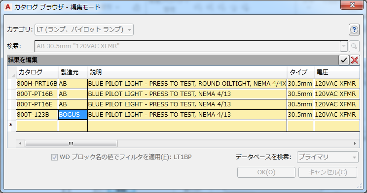 サンプルのカタログ情報が AutoCAD Electrical toolset に用意されています。カタログ情報は、Access データベース ファイル(.mdb)のテーブルに保持され、サンプルのベンダー データが入力されています。