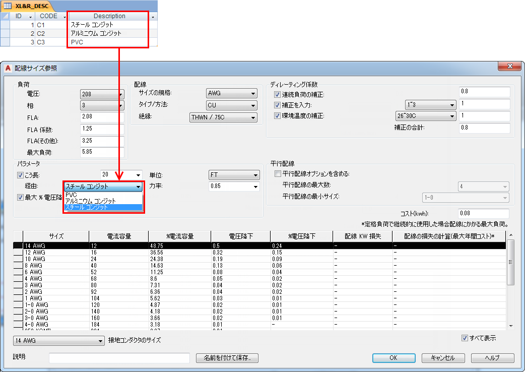 オプションのコンダクタのリアクタンス/AC 抵抗テーブルは、コンジット タイプに基づいて、配線サイズに対するリアクタンスと抵抗値を提供します。これらの値は、こう長を指定した場合に、給電配線における電圧降下の割合を計算するために使用されます。