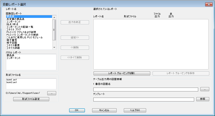 任意の数のレポート出力ファイルを生成し、図面上にレポート表を配置します。レポートおよび関連付けられている形式ファイル(.set)を選択します。