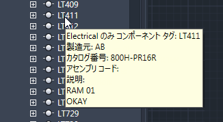 コンポーネント ツリーの表示は、デバイス タイプに応じて異なります。エレメカ コンポーネントを挿入する際は、一意の名前(装置コード、ロケーション コード、コンポーネント タグ)、ピン番号、端子番号を指定することをお勧めします。たとえば、図面にケーブル マーカーがあり、ケーブル タグの値が重複している場合、コンポーネント ツリー表示や[接続]タブのコンポーネントについて予期しない動作が発生する可能性があります。この問題は、[ロケーション ビュー]の端子およびケーブル マーカーで発生する頻度が高いことが確認されています。