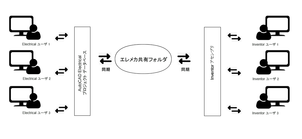 エレメカ プロジェクトの同期機能を使用することで、AutoCAD Electrical toolset プロジェクトと Inventor プロジェクトの間でデータの整合性を管理および維持することができます。エレメカ プロジェクトの同期では、データ交換のプロセスでプッシュとプルの手法が採用されています。AutoCAD Electrical toolset ユーザの場合、Inventor のデータが最初に取り込まれ、コンポーネント ツリー表示が更新されます。次に、AutoCAD Electrical toolset のデータが Inventor に移動されます(プッシュされます)。ネットワークから切断し、リンク ファイルとの接続が解除されると同期できなくなりまが、図面ファイル上でオフラインで作業を続行し、[ロケーション ビュー]タブを使用してコンポーネントを管理することができます。ネットワークでリンク ファイルへの接続を再確立した後、オフラインでの作業を同期することができます。