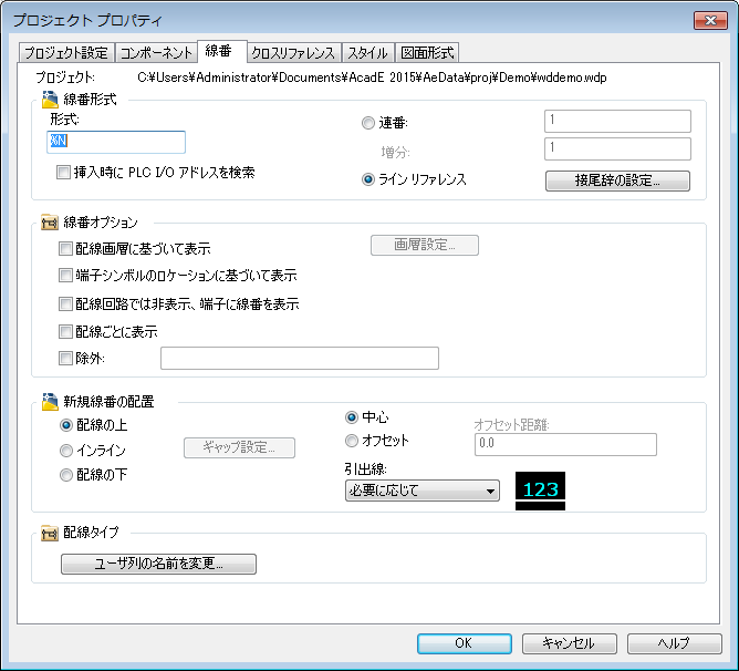 [プロジェクト プロパティ]または[図面プロパティ]ダイアログ ボックスを使用して、プロジェクトまたは図面の既定、コンポーネント、線番、クロスリファレンス、スタイル、および図面形式の設定を指定することができます。各タブに使用できるオプションの概要を次のセクションに一覧表示します。