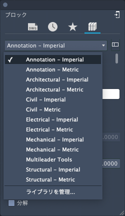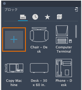 現在の図面、最近使用、お気に入り、またはブロックが保存されているライブラリにアクセスしてそこからブロックを挿入することができます。