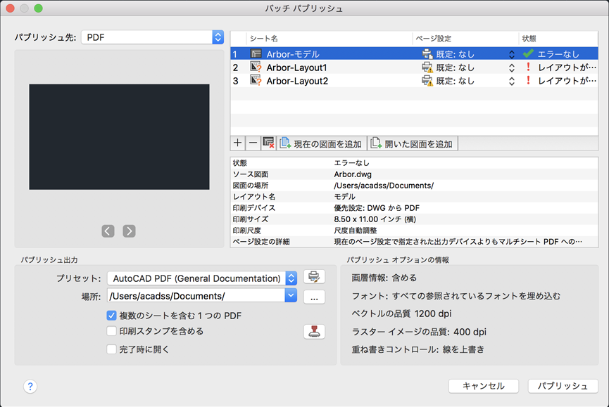 図面セットを PDF ファイルにパブリッシュしたり、ハード コピー出力用にページ設定で指定されているプリンタに送信することができます。