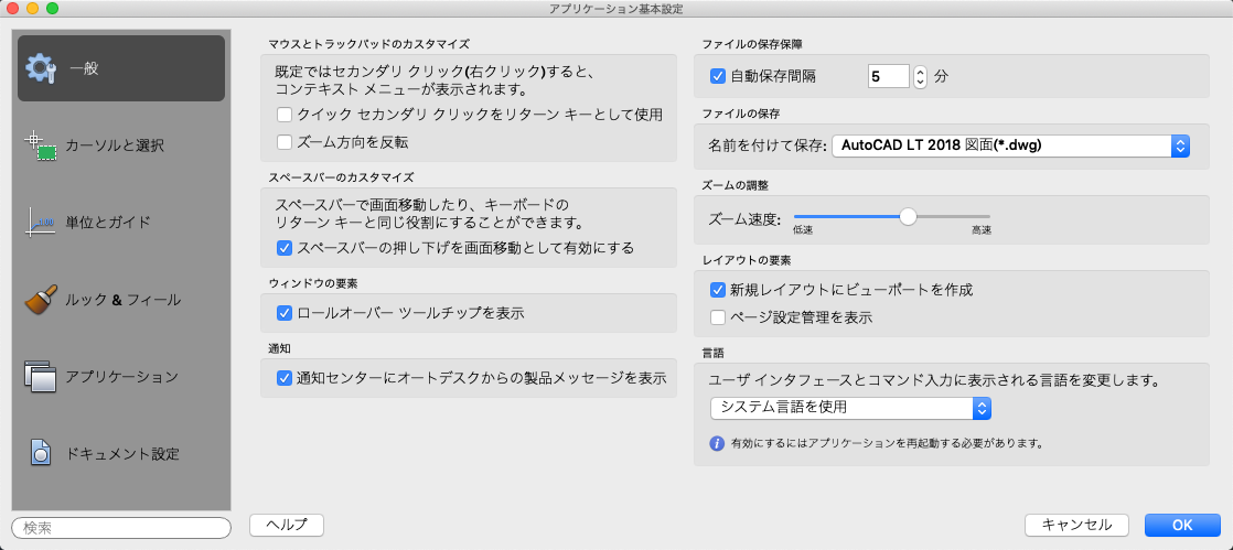 マウスのホイールを前方または後方に回転したとき、または Magic Mouse やトラックパッドでシングル スワイプしたときに、表示倍率がどれだけ変更されるかをコントロールします。(システム変数 ZOOMFACTOR)