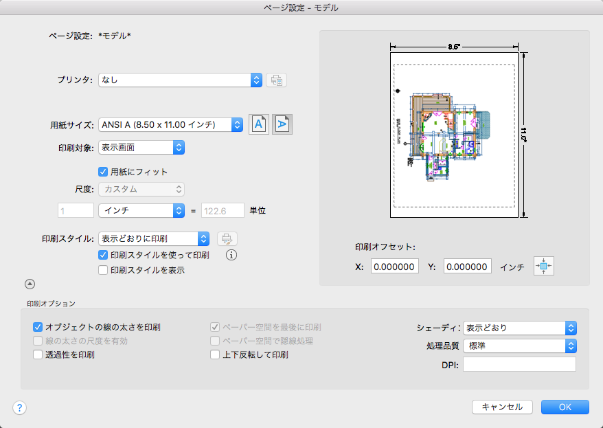 [レイアウト]、[図面範囲]: レイアウトを印刷する場合は、レイアウトの 0,0 から基点が計算され、指定した用紙サイズの印刷可能領域の内側にすべてが印刷されます。[モデル]タブから印刷する場合は、グリッド範囲で定義した作図領域全体が印刷されます。現在のビューポートにプラン ビューが表示されていない場合、このオプションは、[オブジェクト範囲]と同じ効果になります。