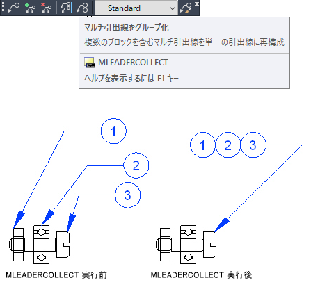 内容としてブロックを使用したマルチ引出線オブジェクトを、1 つの参照線に集めて、アタッチできます。MLEADERCOLLECT[マルチ引出線グループ化]コマンドを使用すると、マルチ引出線が、図面での必要性に応じて、水平、垂直、または指定した領域内に集約されます。