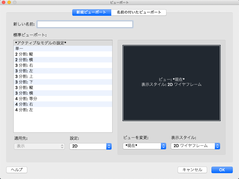 Specifies either a 2D or a 3D setup. When you select 2D, the new viewport configuration is initially created with the current view in all of the viewports. When you select 3D, a set of standard orthogonal 3D views is applied to the viewports in the configuration.