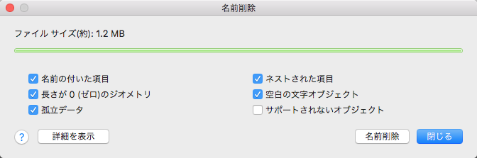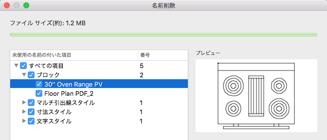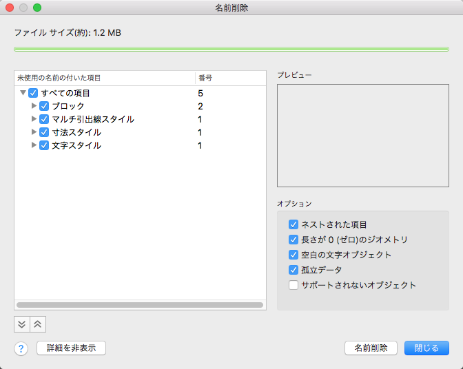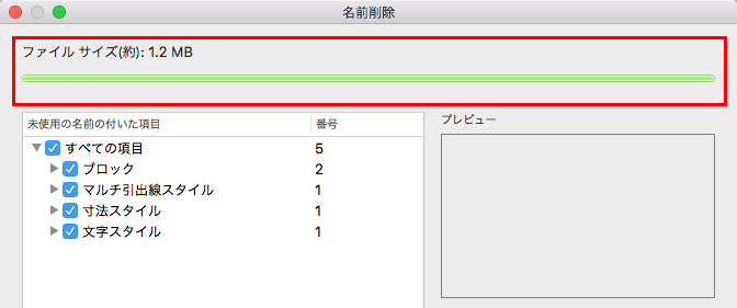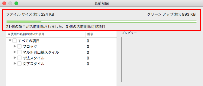 名前削除する項目を選択して[名前削除]をクリックすると、縮小された図面ファイル サイズの量と、さらに名前削除可能な量が表示されます。