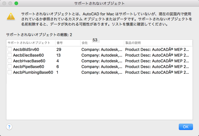 AutoCAD for Mac はサポートしていないが、現在の図面内で使用されているか参照されているカスタム オブジェクトまたはデータを削除します。[名前削除]を選択すると、現在の図面内の参照されているサポートされないオブジェクトのリストが表示されます。