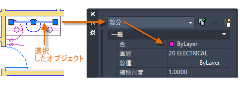 [プロパティ]パレットには、選択したオブジェクトの現在のプロパティが表示されます。これらのプロパティは、項目をクリックし、設定を変更することで修正できます。[ByLayer]に設定されているプロパティは、その画層から設定を継承しています。上記の例では、画層 20 ELECTRICAL 上に作成されたオブジェクトは紫色です。これは、この色がこの画層上のオブジェクトの既定の色であるためです。