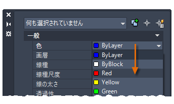 [プロパティ]パレットには、重要なプロパティの設定がすべてリストされます。使用可能なフィールドをクリックすれば、その現在の設定を変更できます。次の例では、オブジェクトが選択されていない場合、現在の色は[ByLayer]から[Red]に変更されます。これ以降に作成するオブジェクトには、[Red]の色プロパティが割り当てられます。