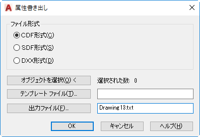 属性データを書き出すファイルの名前と場所を指定します。属性データを書き出すファイルのパスと名前を入力するか、[出力ファイル]ボタンをクリックし、標準のファイル選択ダイアログ ボックスを使用して、既存の出力ファイルを検索します。CDF または SDF ファイルの場合はファイル拡張子は .txt になり、DXF ファイルの場合は .dxx になります。