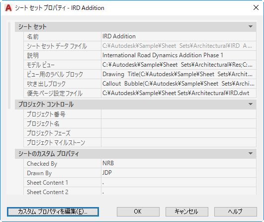 [シート セットのカスタム プロパティ]ダイアログ ボックスが表示されます。