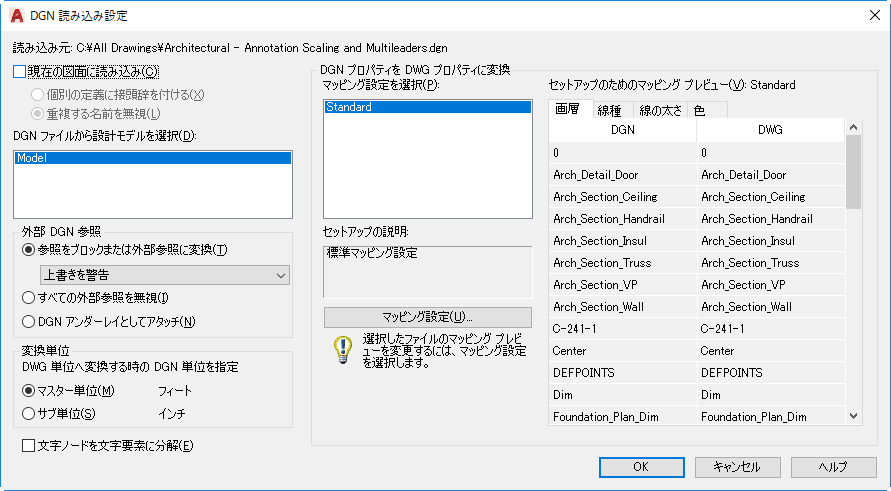 変換に適した変換単位を選択します。読み込まれた DGN ファイルには、「マスター単位」と「サブ単位」と言われる作業単位(フィート/インチ単位かメートル単位)が含まれます。選択した作業単位(マスター単位またはサブ単位)は、DWG の単位に 1 対 1 で変換されます。