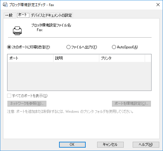 使用可能なローカル ポートとネットワーク ポートのリスト、および各ポートの説明が表示されます。ネットワーク ポートの場合は、ネットワーク プリンタの名前も表示されます。