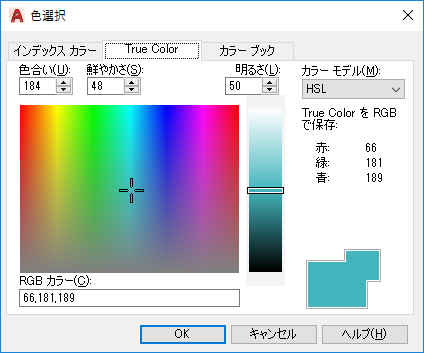 RGB カラー モデルを使用して、色を選択します。[True Color]タブで使用できるオプションは、HSL と RGB のどちらのカラー モデルを指定するかによって異なります。
