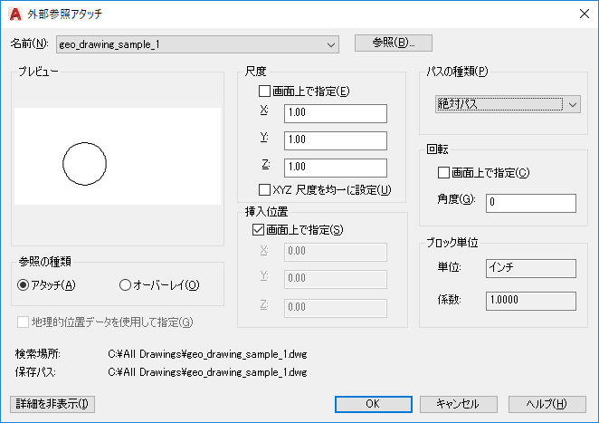 外部参照ファイルをアタッチしたとき図面とともに保存されるパスが表示されます。パスは、[パスの種類]の設定によって異なります。
