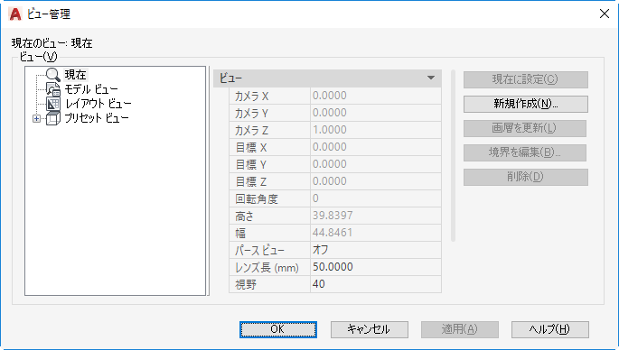 モデル ビューおよびレイアウト ビューに対して、名前の付いたビューに割り当てられているビューの種類が表示されます。