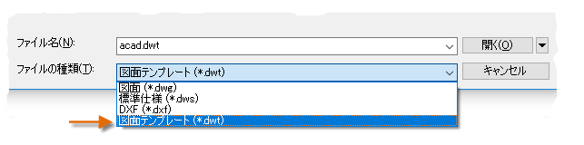 既存の図面テンプレート ファイルを修正するには、[開く]をクリックし、[ファイルを選択]ダイアログ ボックスで[図面テンプレート(*.dwt)]を選択し、テンプレート ファイルを選択します。