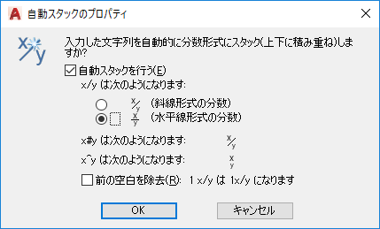 自動スタック機能がオンのとき、スラッシュ(/)を水平線分数に変換します。