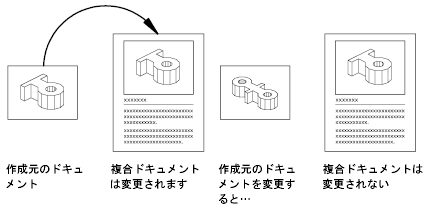 埋め込みとリンクの関係は、AutoCAD でブロックを挿入することと外部参照を作成することとの関係に似ています。